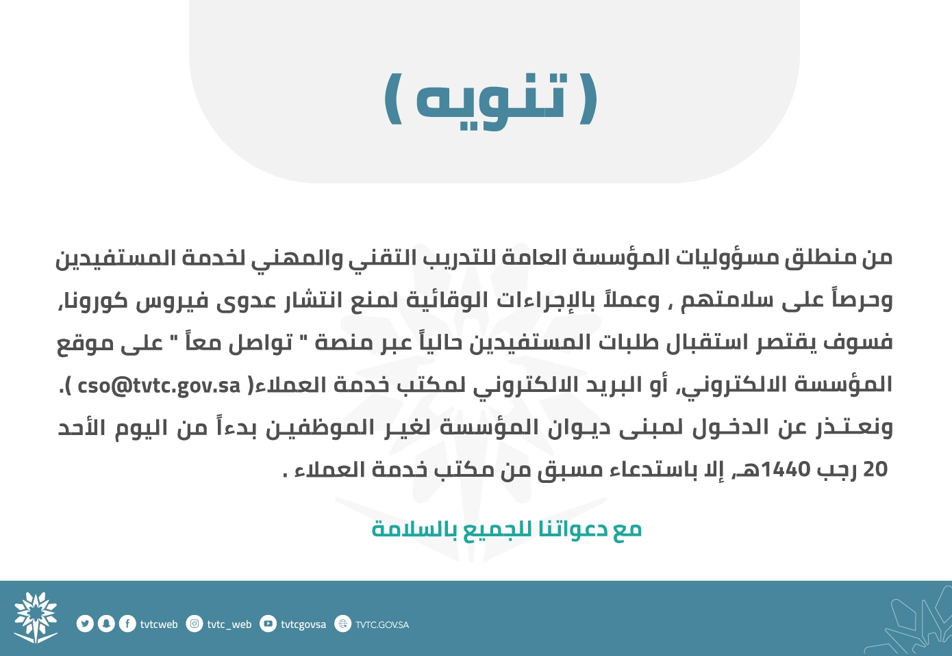 ট ইট র التدريب التقني حرصا على سلامة الجميع سيتم خدمة كافة عملاء المؤسسة عبر قنوات التواصل الالكترونية الخاصة بمكتب خدمة العملاء بدءا من اليوم الأحد Https T Co Lk1twaox0b